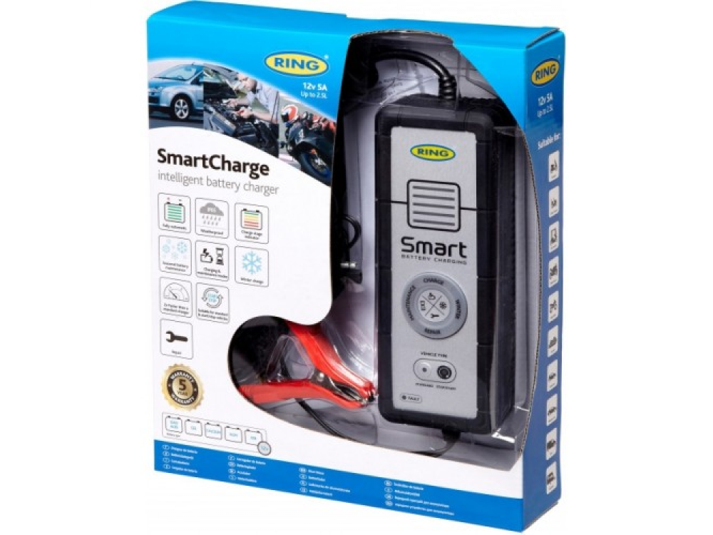 Автоматическое интеллектуальное зарядное устройство Ring RESC605. Светодиодные индикаторы показывают определенный выбранный режим заряда АКБ. Индикатор этапа заряда – отображает степень заряда. Покрыт снаружи резиной для дополнительной защиты и сцепления. Защита от неправильной полярности. Полностью изолированные зажимы. Длина кабеля с зажимами 1,8m.